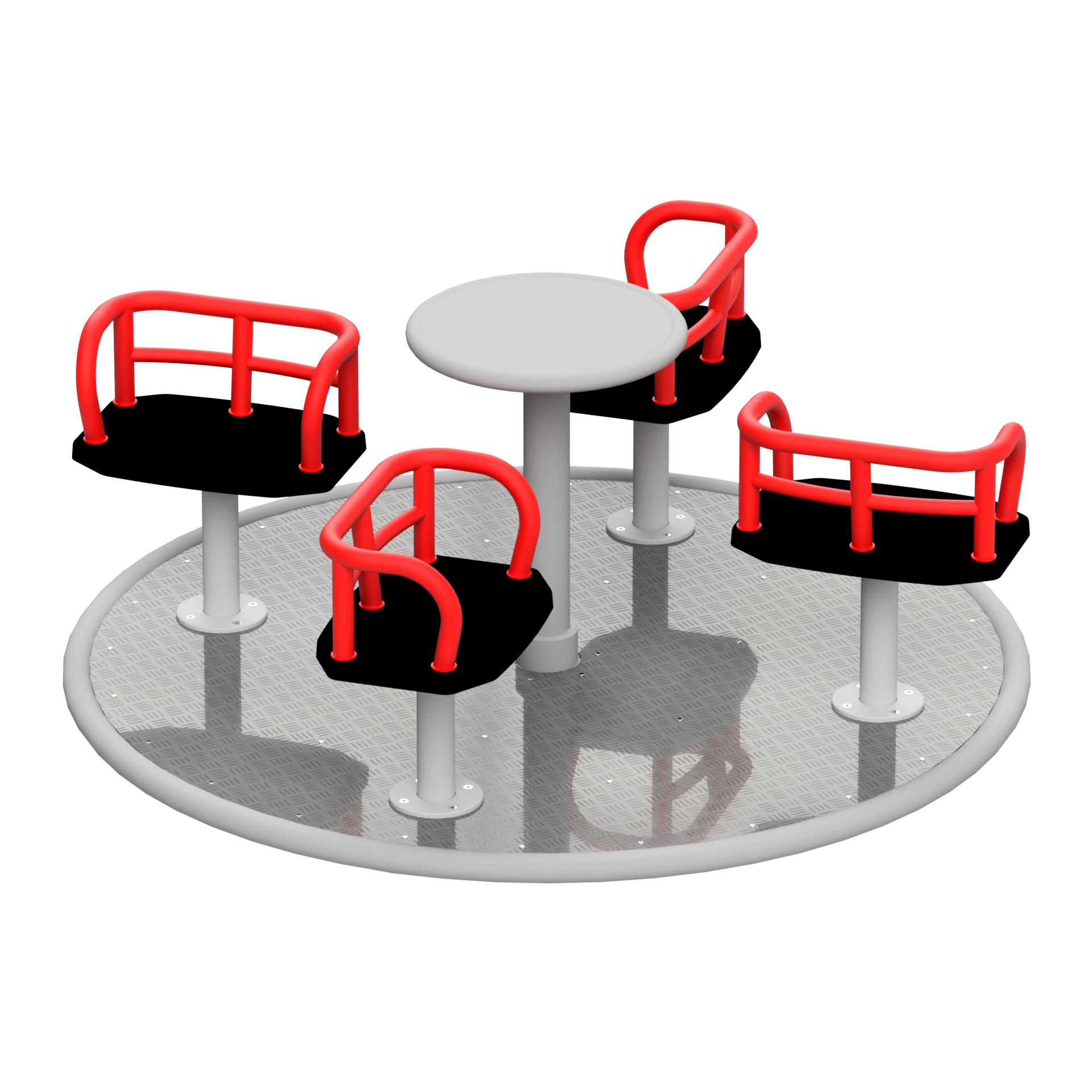 The construction of the Lunapark 4 carousel is based on a durable disc-shaped plate that ensures stability, safety and comfort during rotation. The model is equipped with four ergonomic chair-style seats bolted to the carousel disc and a centrally positioned steering wheel, allowing children to independently set the disc in motion and control the speed of rotation. This design promotes physical activity and develops strength, coordination and teamwork among participants.
