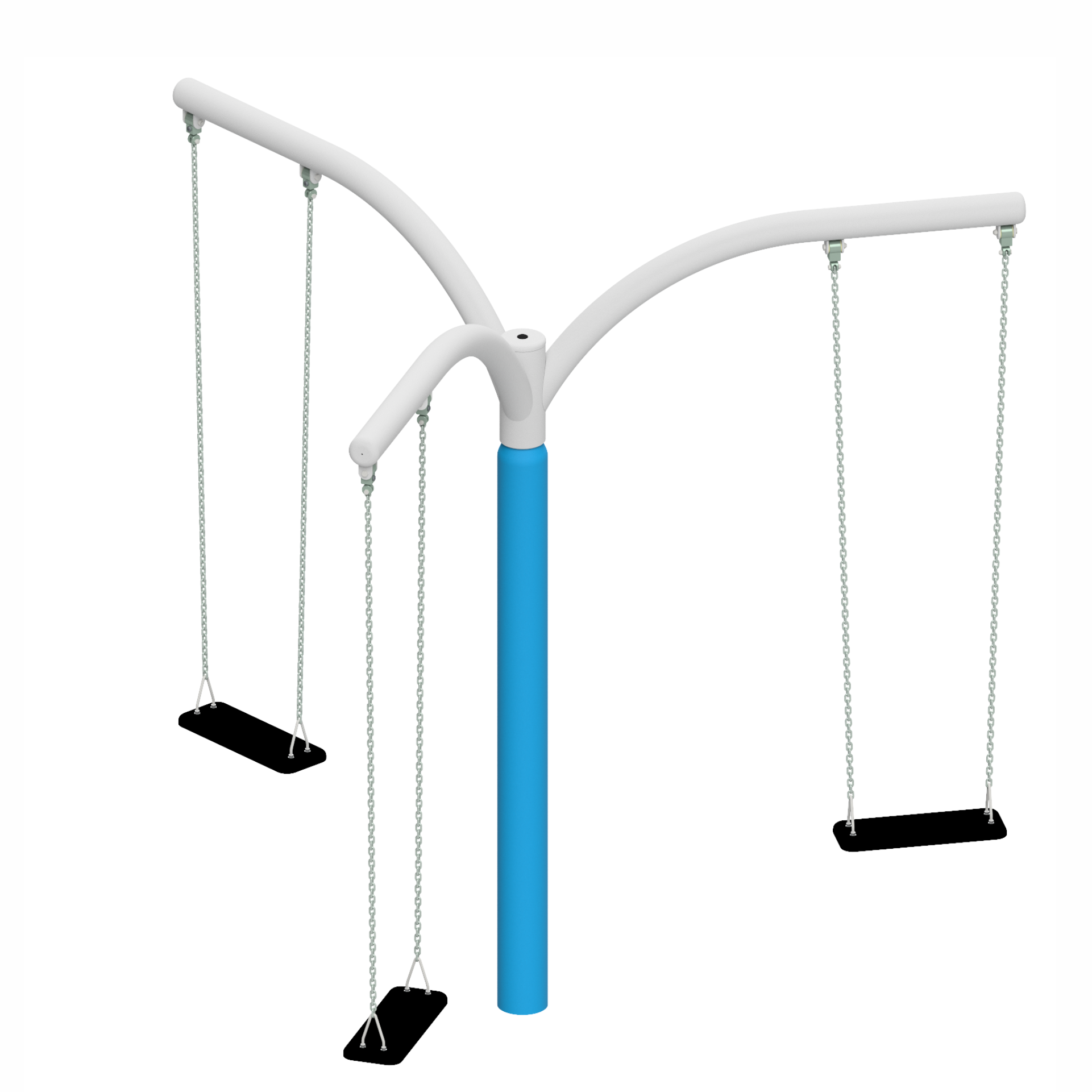Strong, certified chains and flat board-type seats made of durable material embedded in composite have been used. Thanks to the rotating structure, the entire unit moves around the central post, offering a “two-in-one” effect – the ability to swing combined with rotational movement.