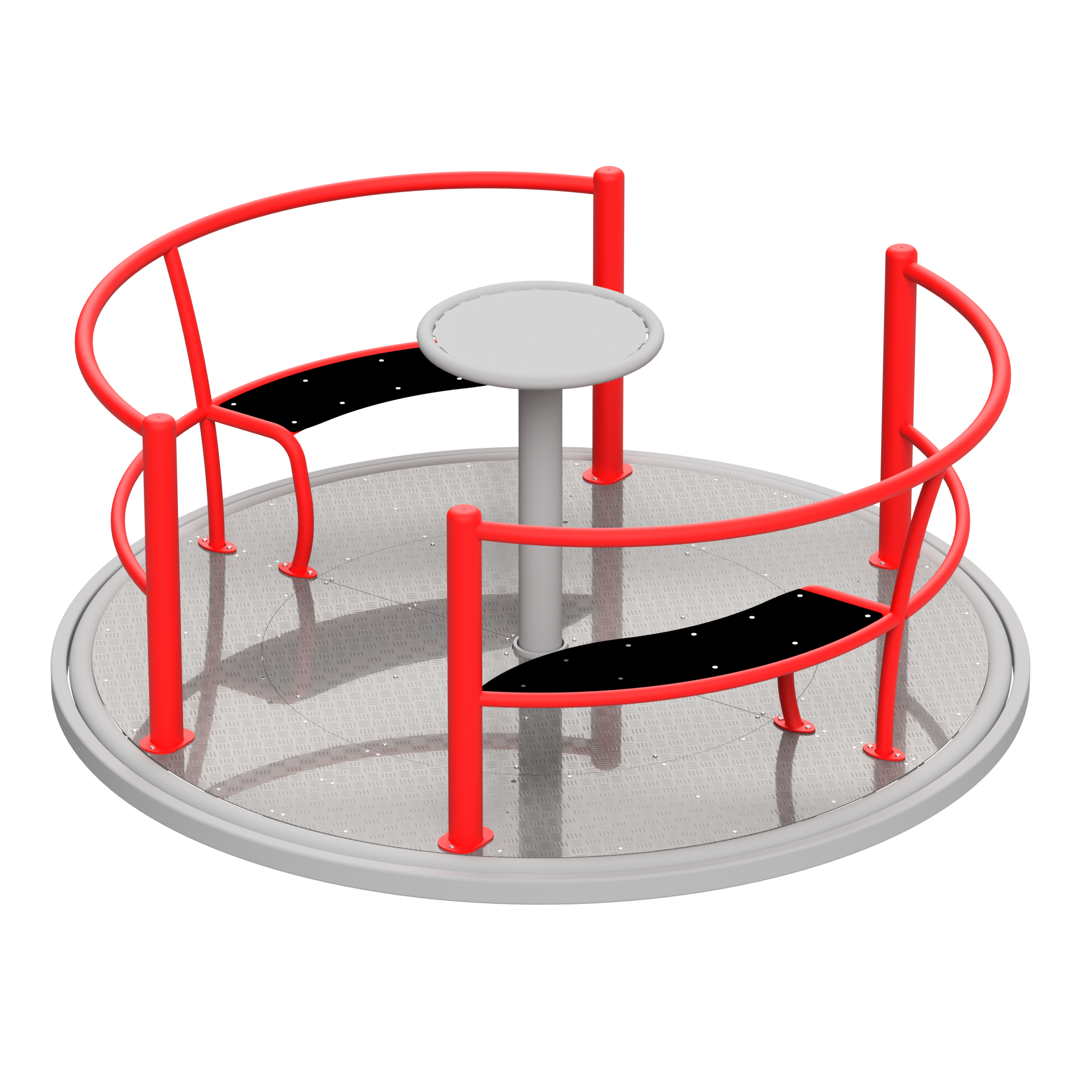 The platform is made of chequered aluminium plate, which provides high abrasion resistance, excellent grip and safe use in all seasons. The carousel’s construction is made of steel with anti-corrosion protection and powder coating, guaranteeing long-lasting durability even under intensive use.