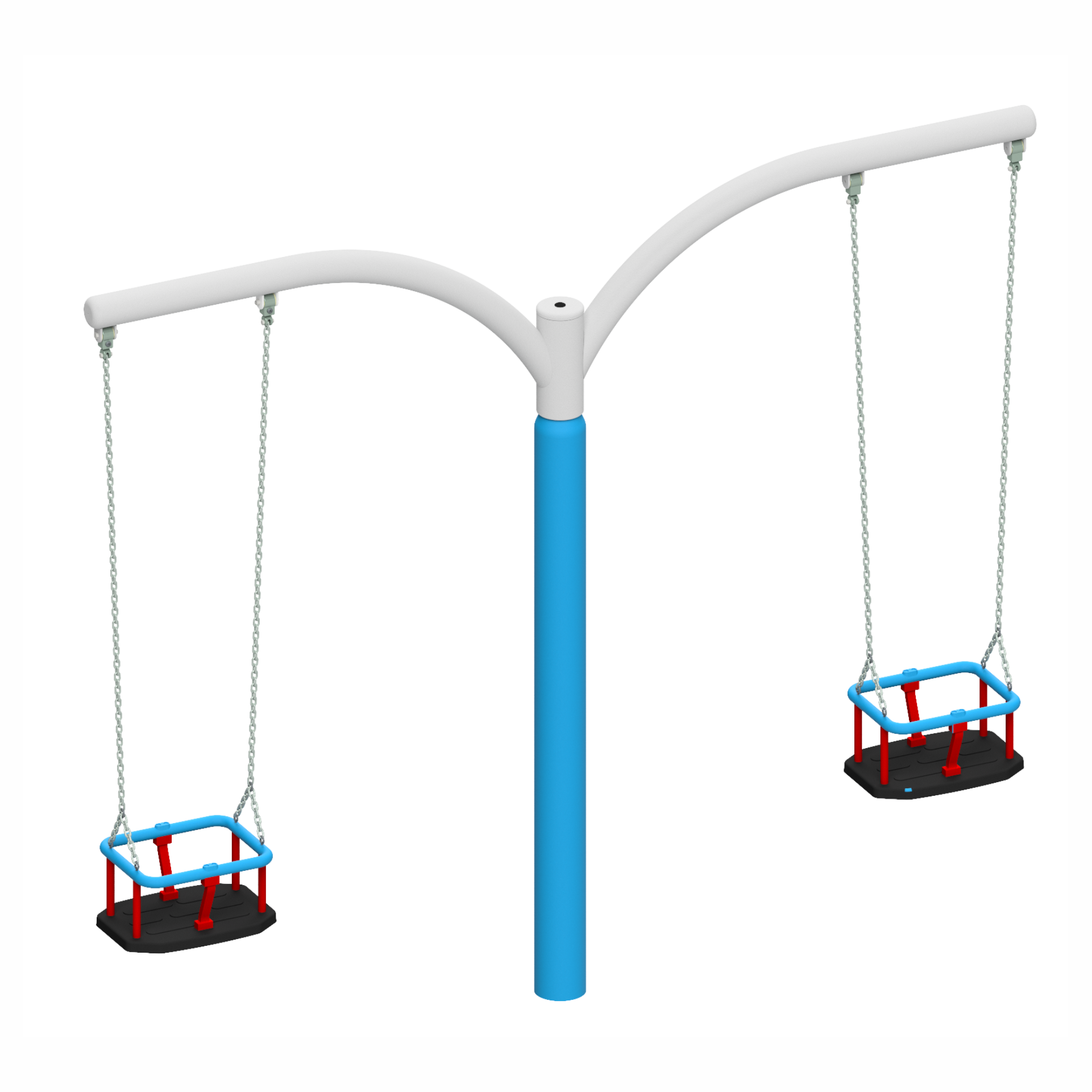 Suspended on strong, certified chains, the cradle seats provide a high level of safety for the youngest users. Their enclosed form stabilizes the child’s posture, protects against sliding out and provides comfort during play. Combined with the rotational movement of the entire structure around the central post, the equipment offers a unique “two-in-one” effect – toddlers can gently swing while simultaneously experiencing gentle rotational movement.